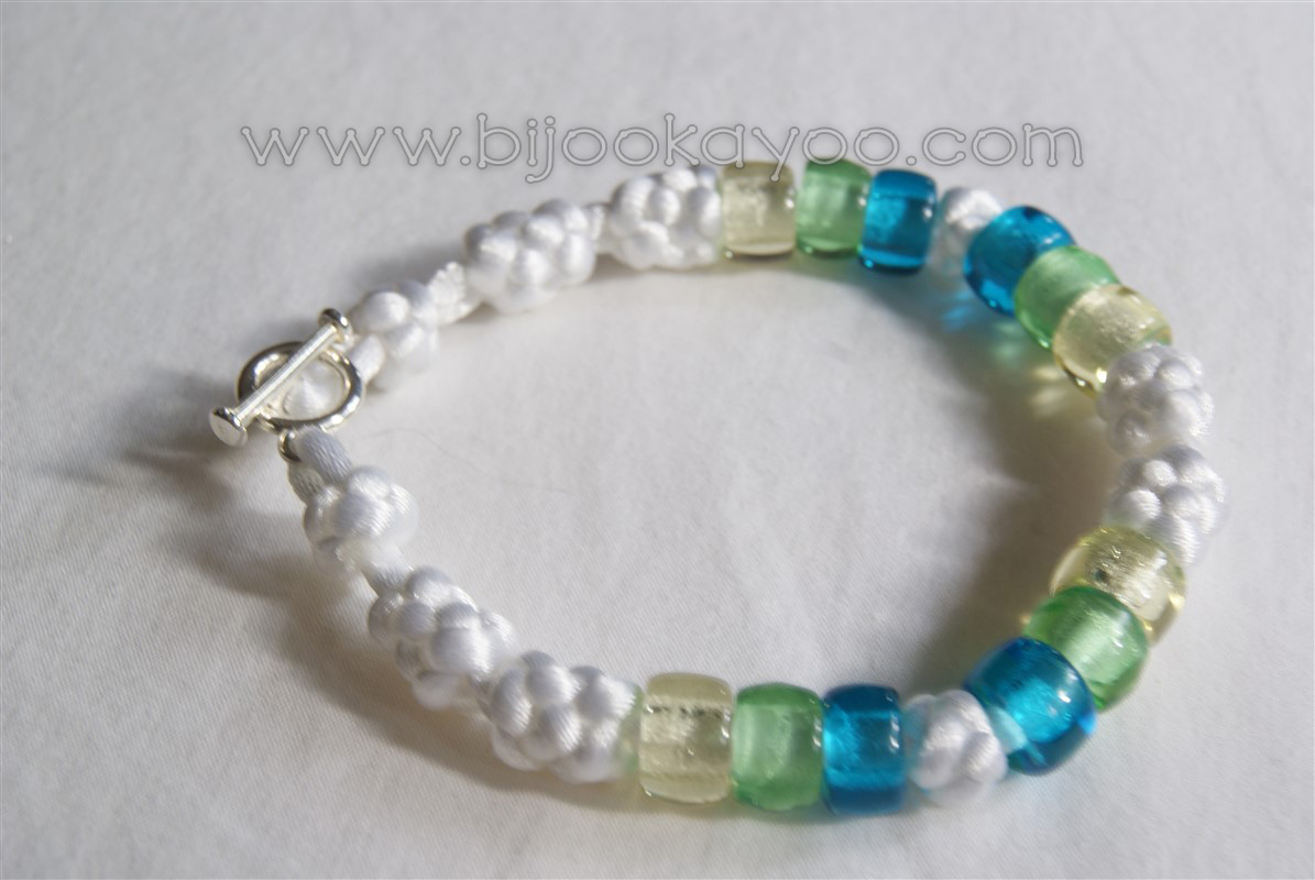This bracelet is made of two white 2mm satin cords and glass beads.