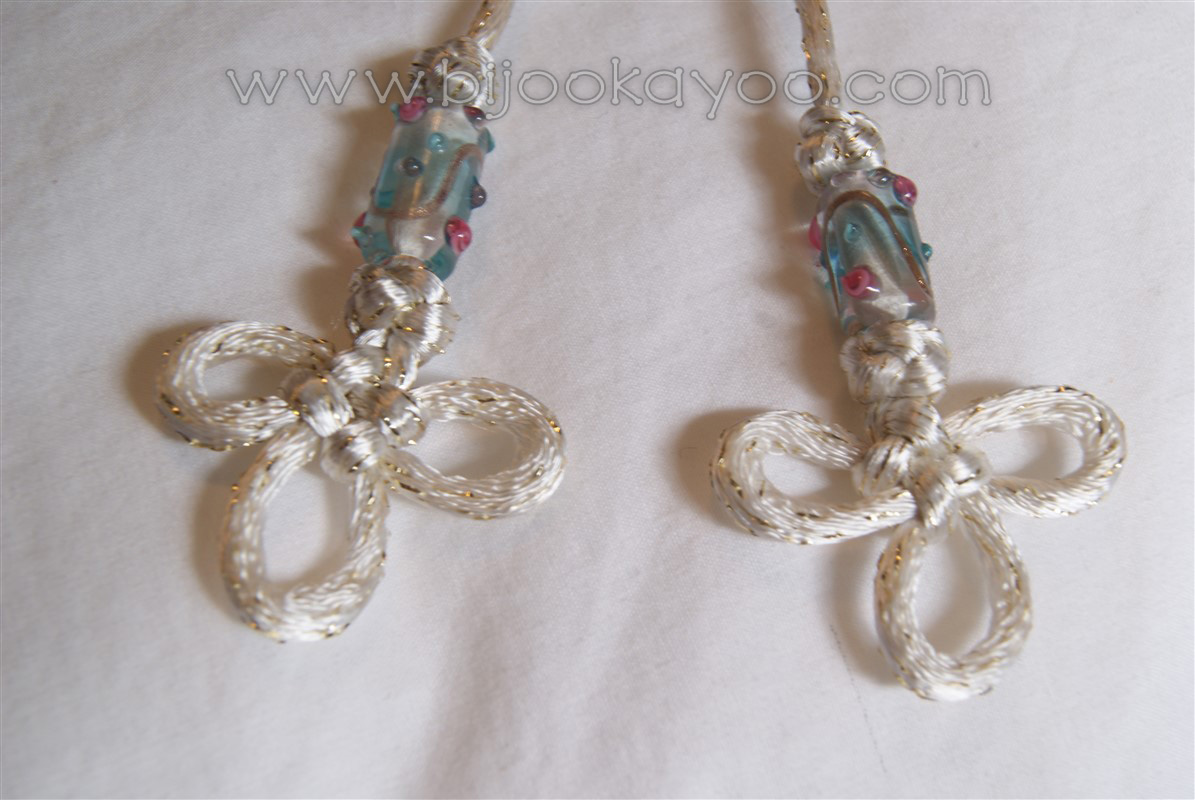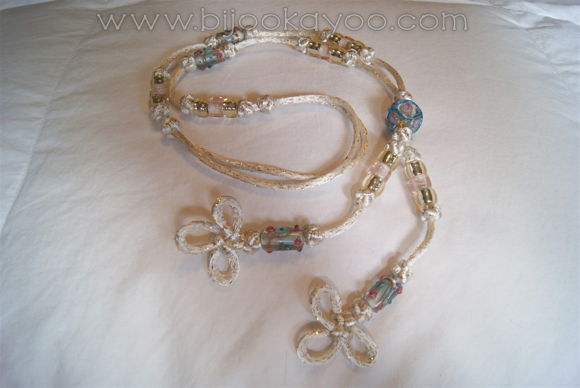 It features two Clover Leaf knotted parts with glass beads as the pendant, a junction made of a Venetian glass bead, and free cord with Button knots and beads as the chain.