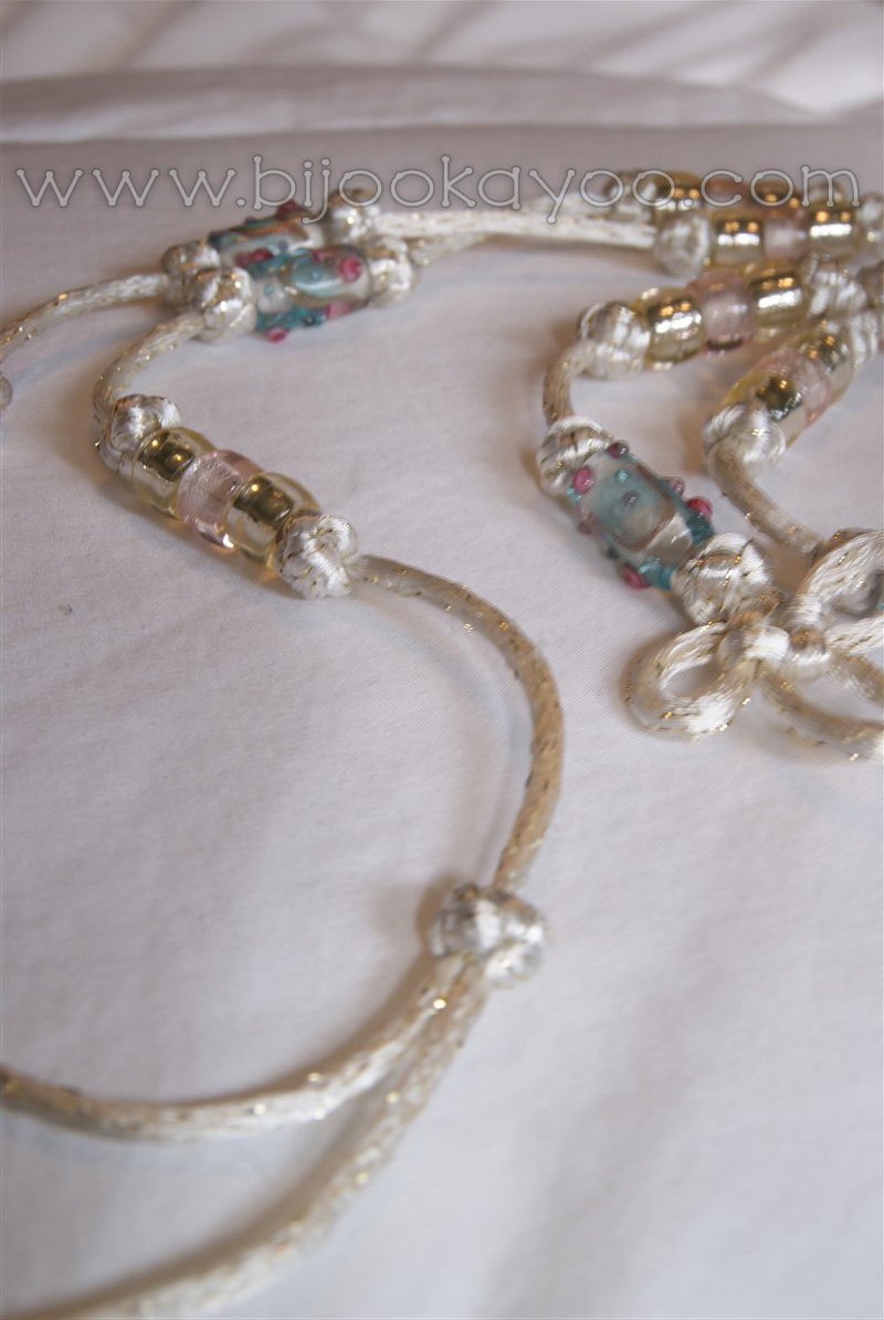This long necklace is made of an ivory 2mm satin cord with golden thread, a round Venetian glass bead, tube lampwork beads, and spacer glass beads.