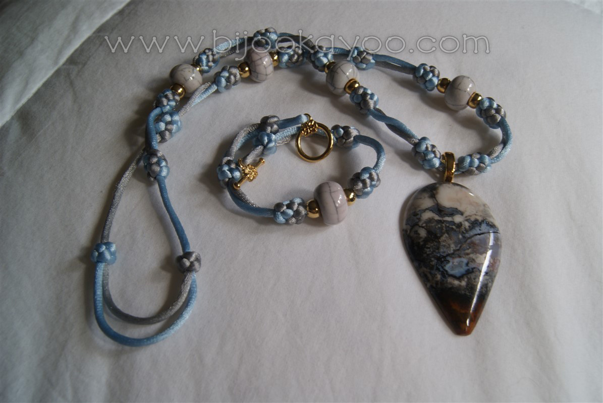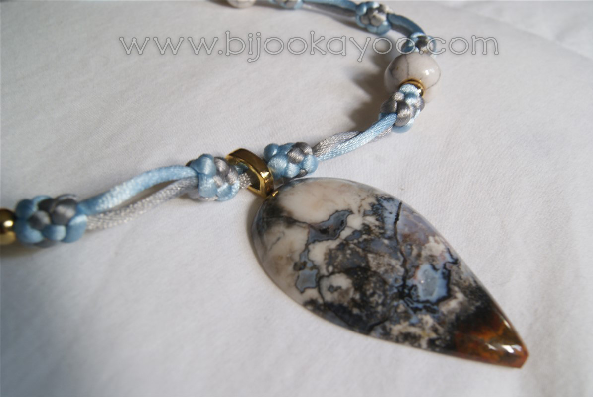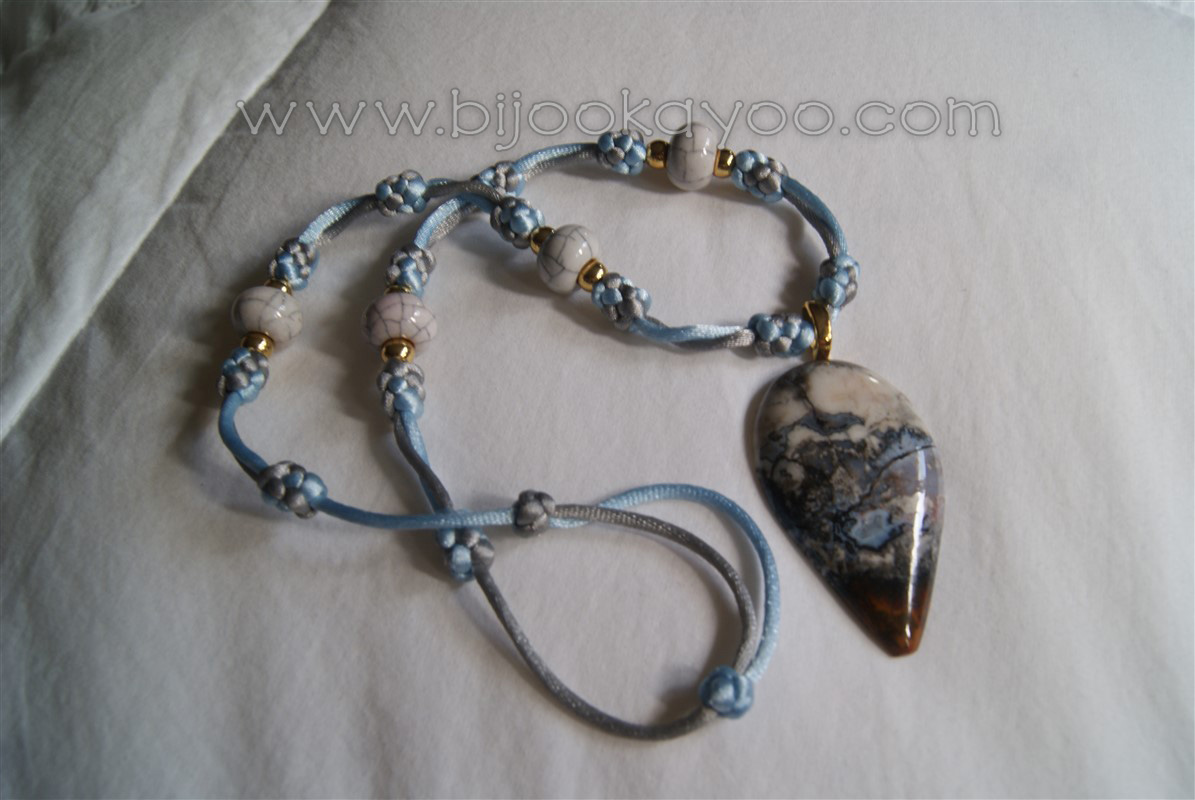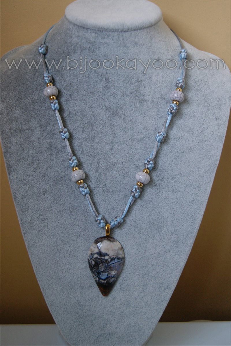 This necklace is made of two 2mm satin cords, a blue mist one and a light grey one, and a natural blue/grey/brown stone pendant I bought from the local Port Moody Rock and Gem Club.