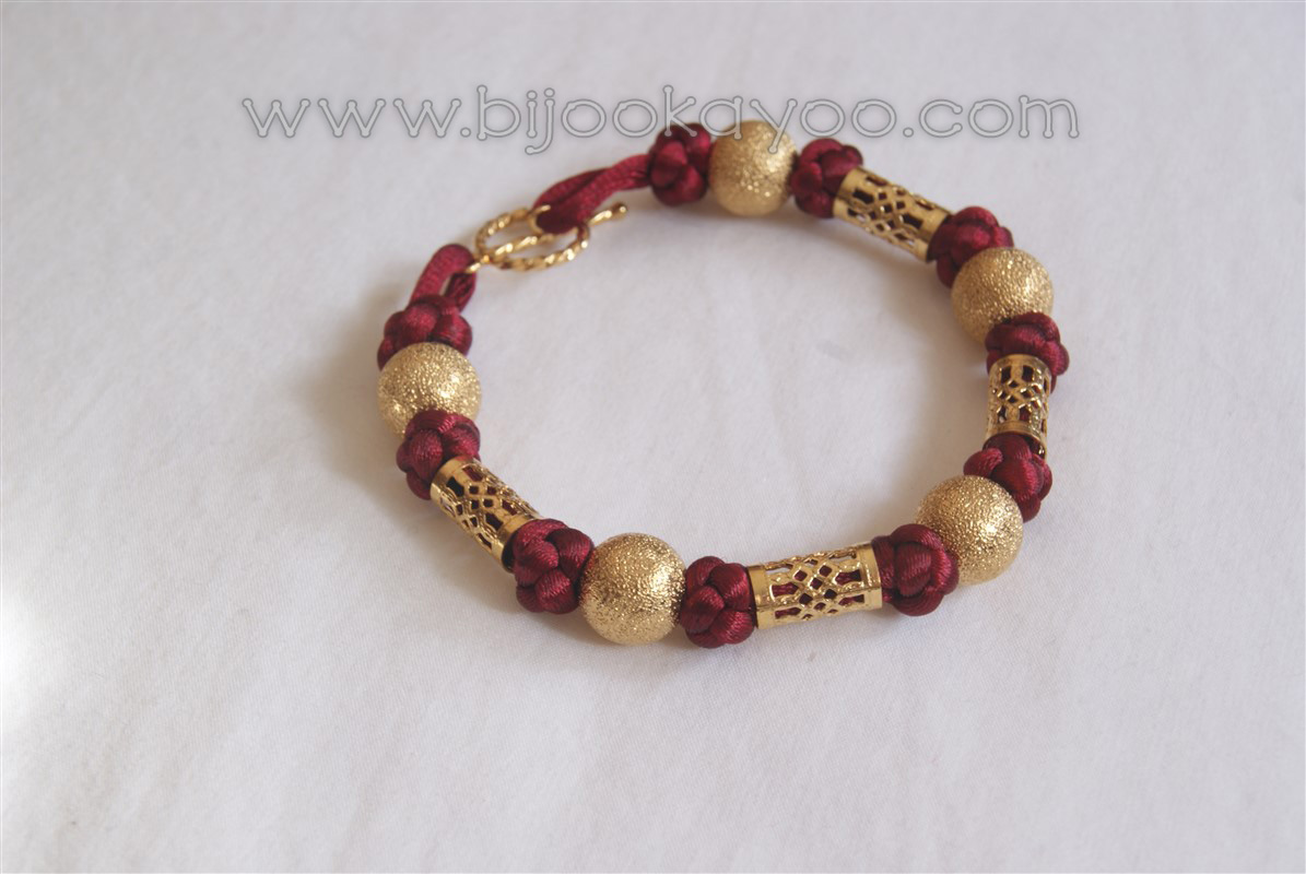 This bracelet is made of a dark red 2mm satin cord and golden metal beads.