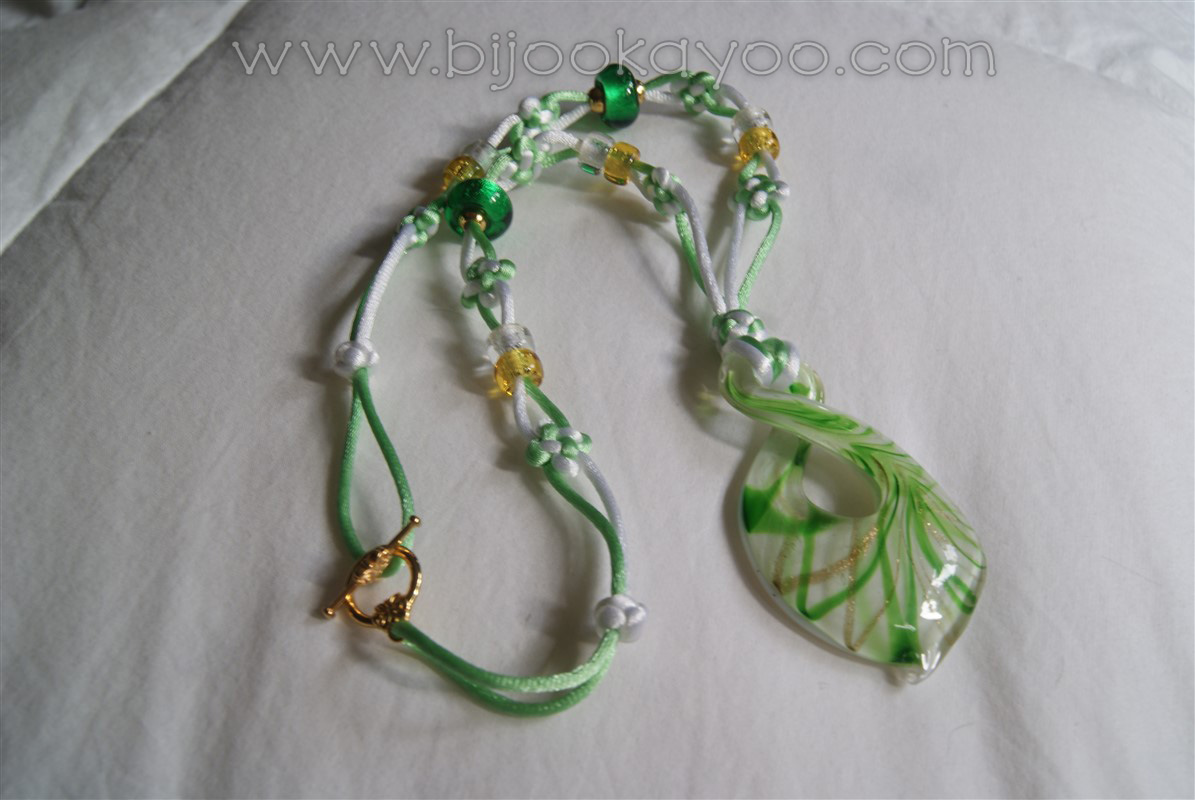 I really like what I’ve done with this necklace. I could have gone with a darker green, but i like the lightness of the cords, and I think that the Four-Leaved Clover knots were a perfect match to the twisted glass pendant.