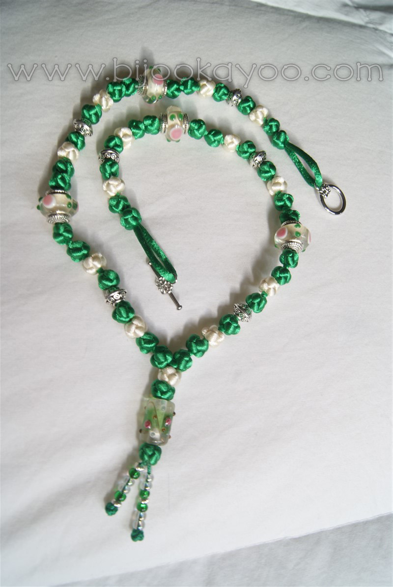 This necklace is made of two 2mm satin cords, one green and one ivory, and a tube lampwork bead and seed beads as a pendant.