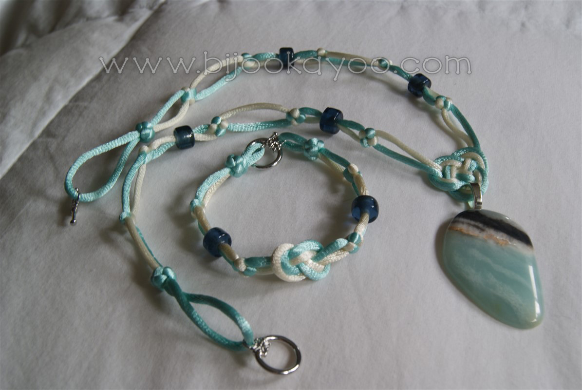 I recently brought this pendant necklace at a local Gem Show and wanted to keep its aqua blue color in the cord. But I found out that a single cord was too light and 2 cords from the same color was too… I don’t know… it was just not right. So, as a black cord would have been too dark and a white one too light, I opted for an ivory one.