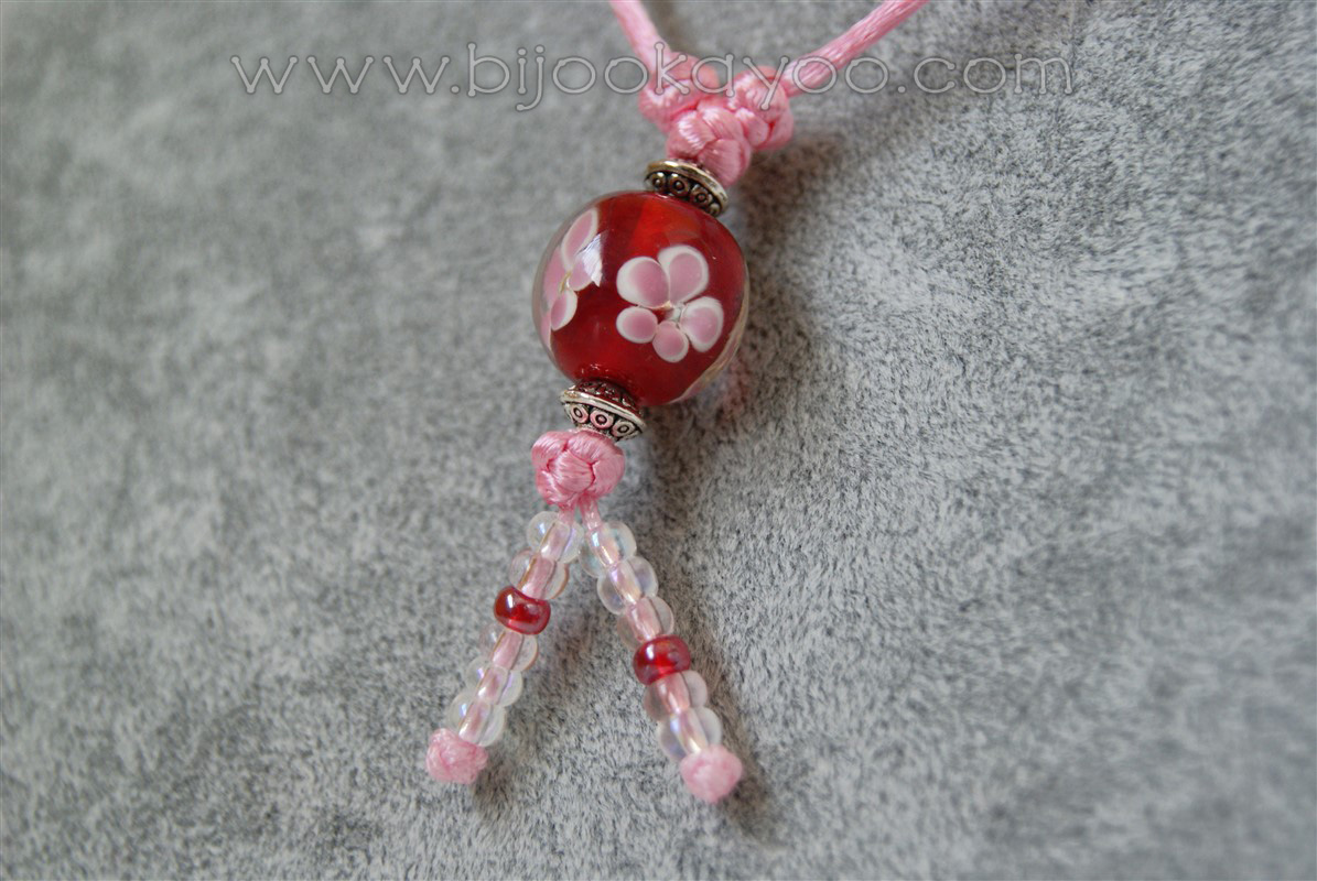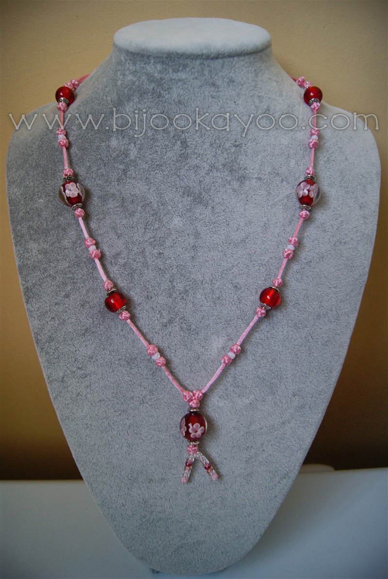 This necklace is made of a light pink 1.5mm satin cord, and a red flowered glass bead with silver spacer and seed beads as a pendant.