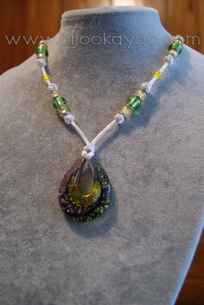 This necklace is made of an ivory with pearly thread 2mm satin cord and a glass teardrop pendant.