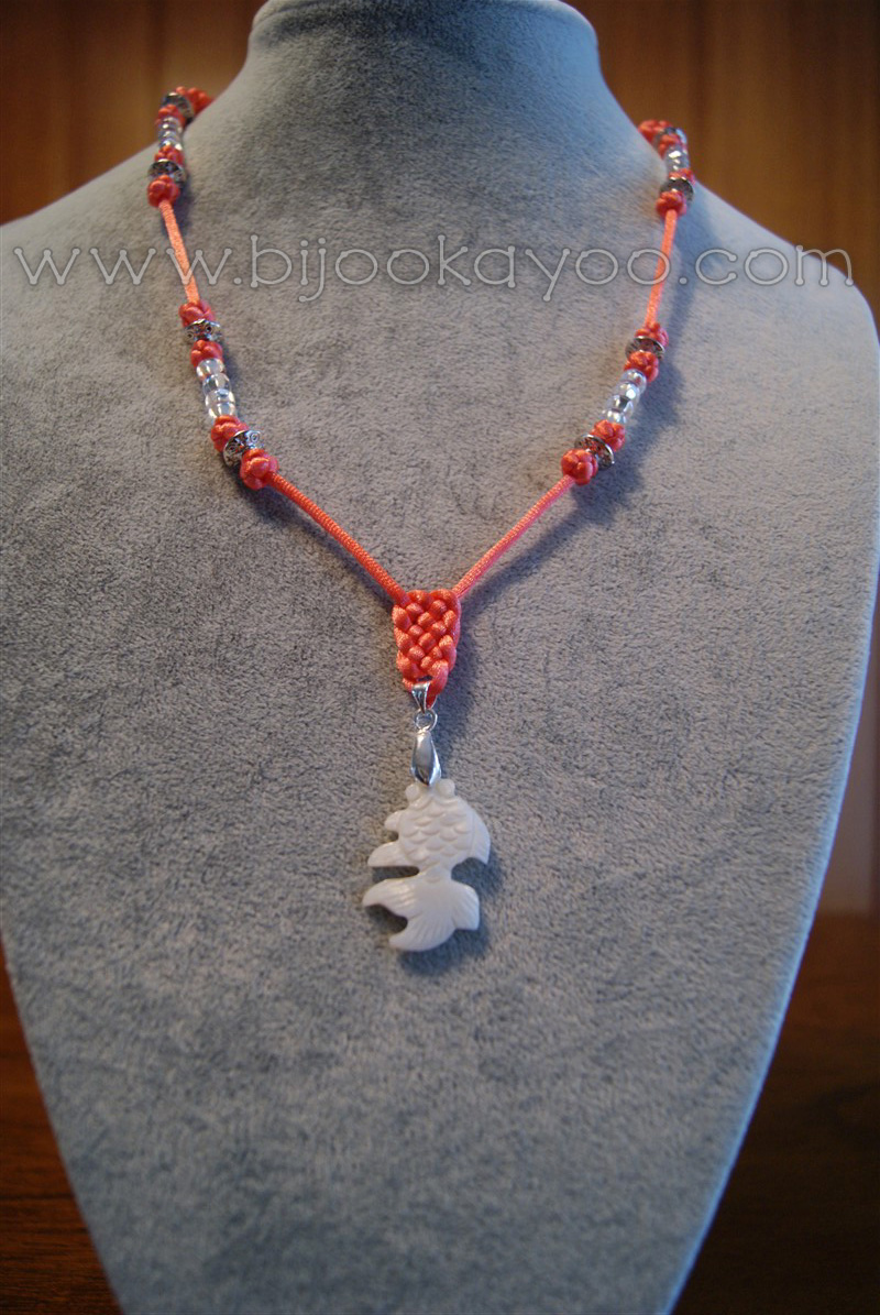 This necklace is made of a light coral 2mm satin cord and a fish-shaped shell pendant with 925 Silver pinch clasp.