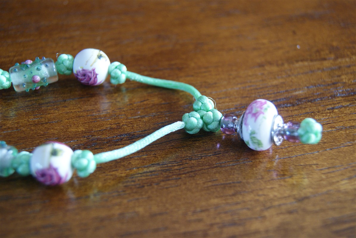 It features Button knots and ceramic beads with Chinese floral drawings, as well as lampwork tube beads along the chain.
