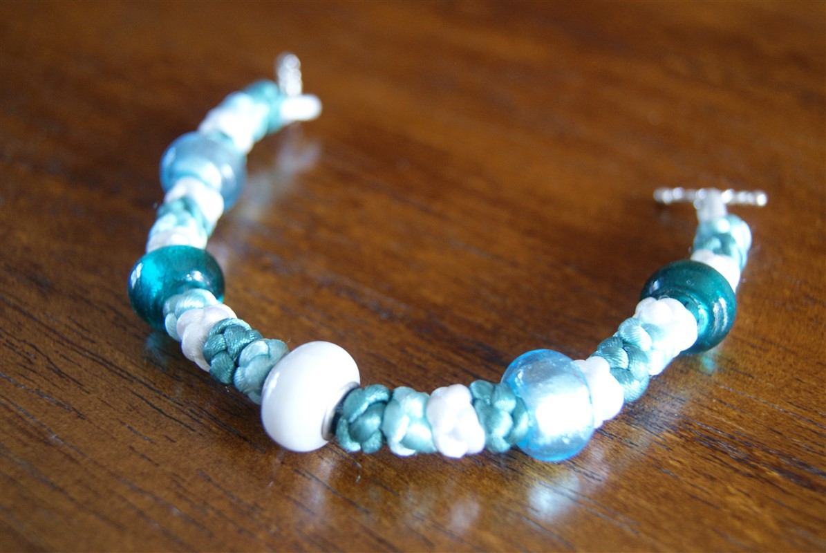 This bracelet is made of three 2mm satin cords, a sea green one, an aqua one and a white one.