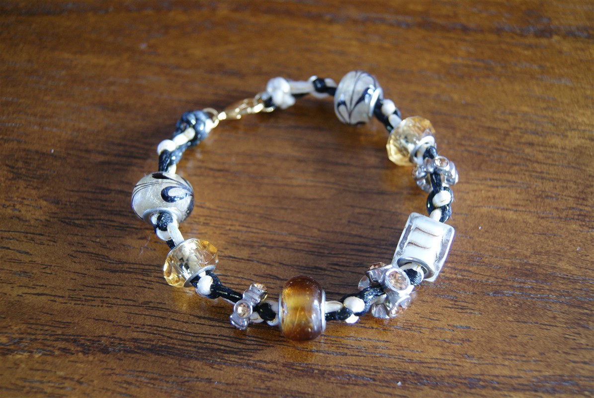 It features Cross and Button knots with Pandora style glass beads, as well as rhinestone and glass beads.