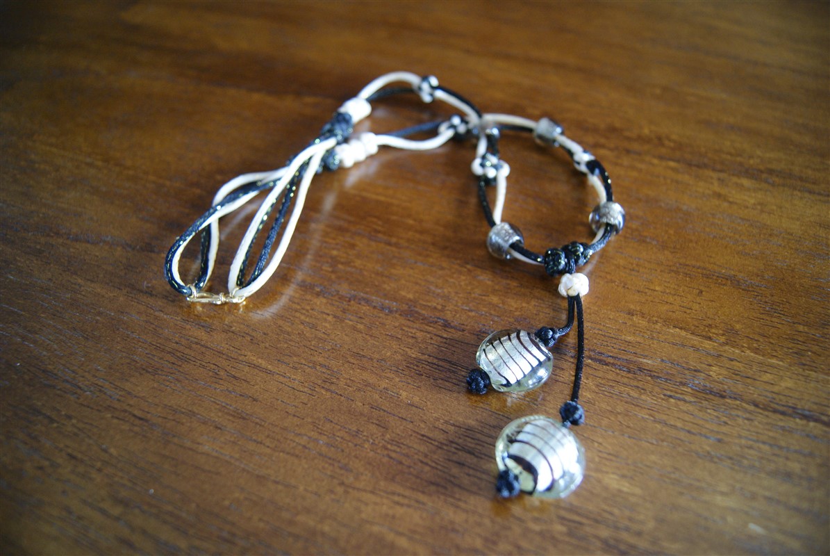 This necklace is made of two 2mm satin cords, a black one and an ivory one, both with a golden thread, and two flatten round silver foil glass beads as pendants.