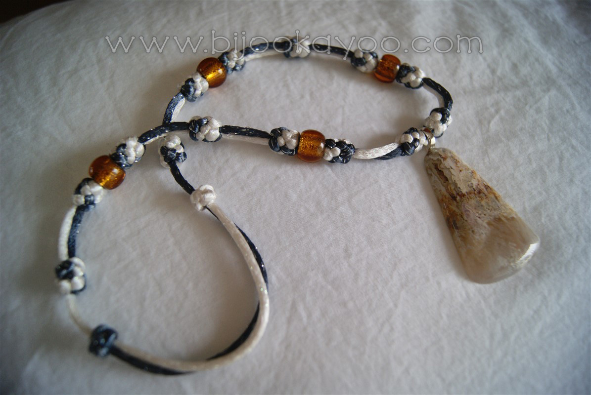 This necklace is made of two 2mm satin cords, a silver-threaded grey one and a pearl-threaded ivory one, and an ivory/light brown plume agate pendant I bought from the local Port Moody Rock and Gem Club.