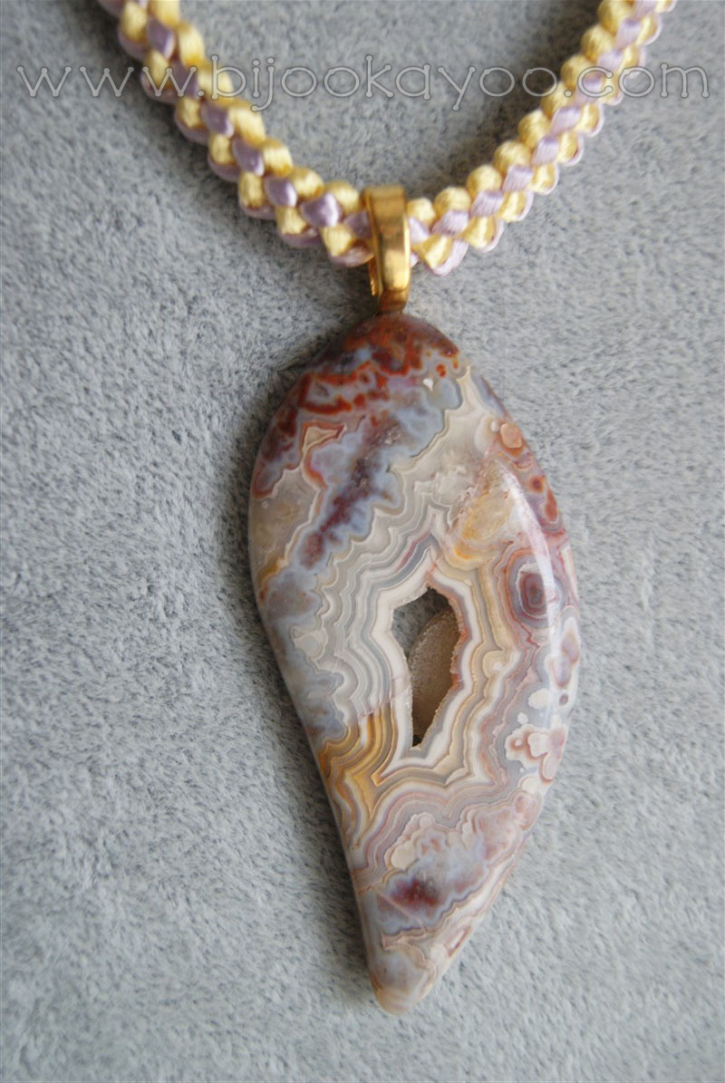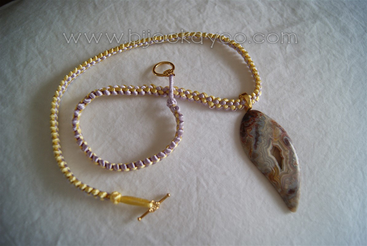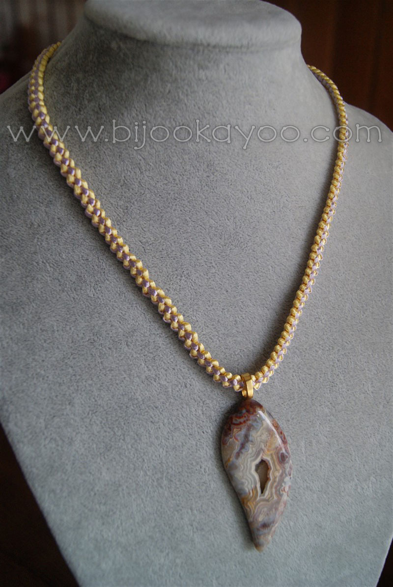 This necklace is made of two 1.5mm satin cords, a light purple one and a light yellow one, and a purple/brown/blue natural stone pendant I bought from the local Port Moody Rock and Gem Club.
