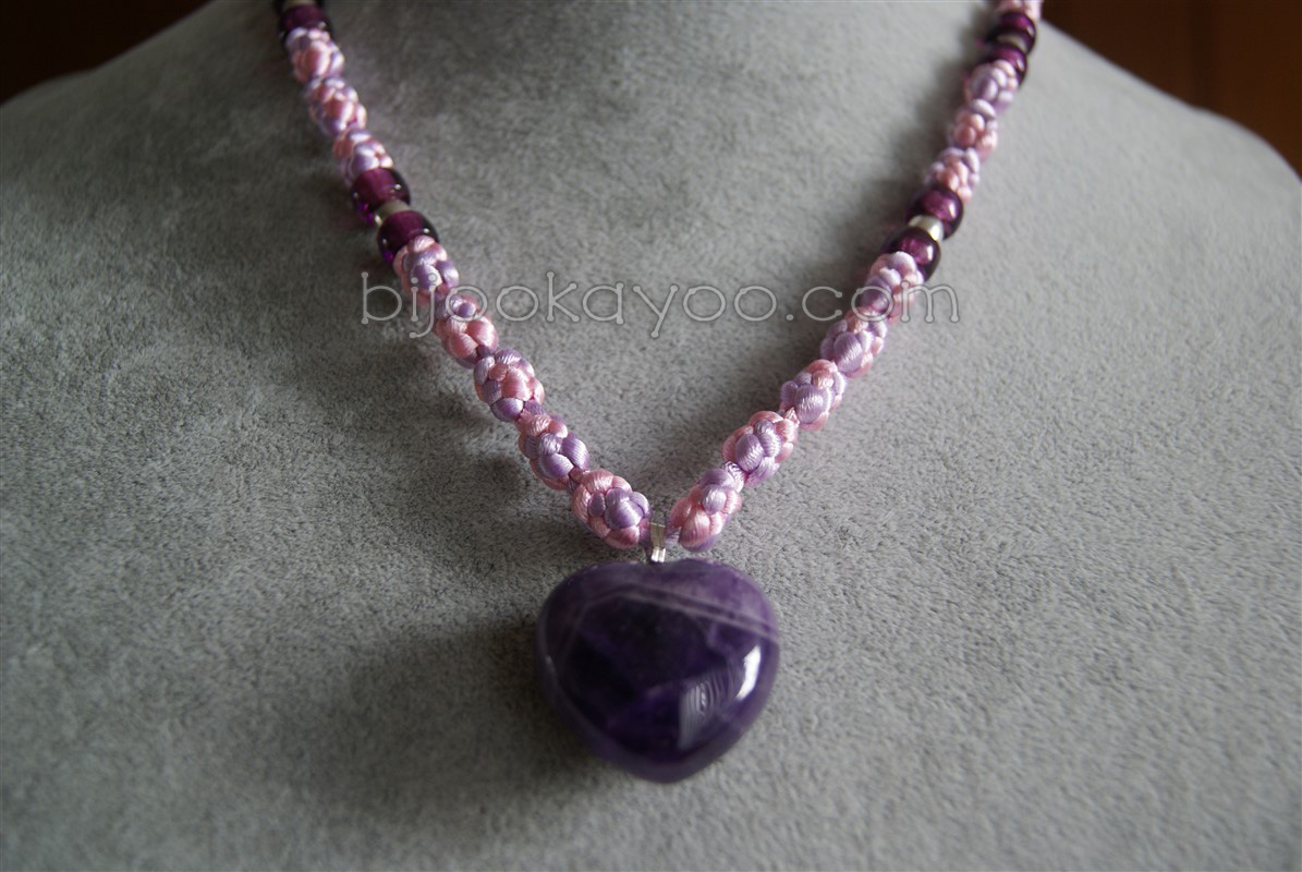 This necklace is made of two 2mm satin cords, a lavender one and a light pink one, and a purple heart-shaped natural stone pendant I bought from the local Port Moody Rock and Gem Club.