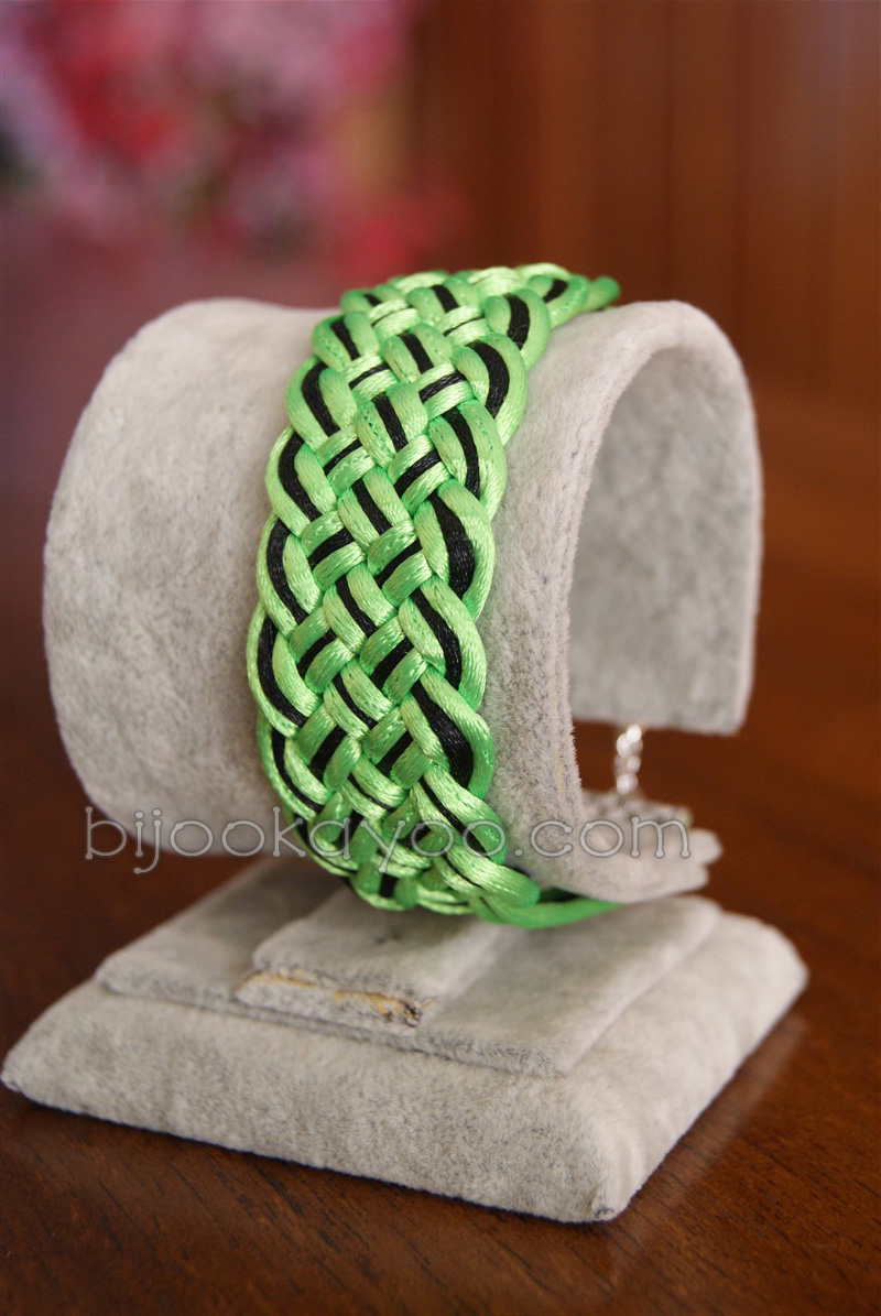 This large bracelet is made of green apple and black 2mm satin cords and silver plated findings.